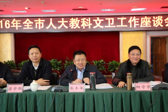 2016年12月8日,达州市人大教科文卫工作座谈会在莲湖宾馆会议室举行。市人大常委会副主任朱丰年出席会议并讲话,常委会党组成员、办公室主任向守宇主持会议。各县(区、市)人大常委会分管领导和教工委负责同志、市级对口联系部门主要负责同志、全市教科文卫系统部分市四届人大代表近90人参加会议。