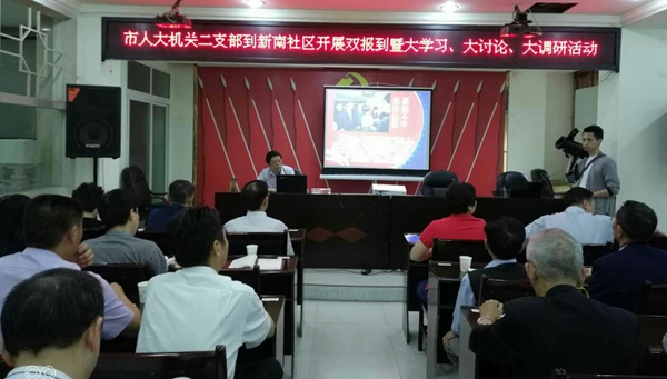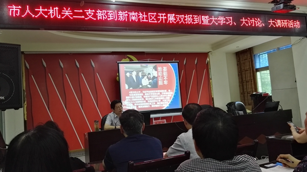 5月30日,市人大常委会副主任胡兵带领人大机关第二党支部全体党员前往达川区新南社区开展“双报到”和“大学习、大讨论、大调研”活动。新南社区班子成员和社区党员以及辖区内部分党员群众70余人参加了此次学习活动。市人大教科文卫委副主任委员、川陕革命根据地历史研究会副会长龚兢业,结合宣传刚刚出台的《中华人民共和国英雄烈士保护法》,作了《铁血主战场 英雄大巴山》专题讲座。