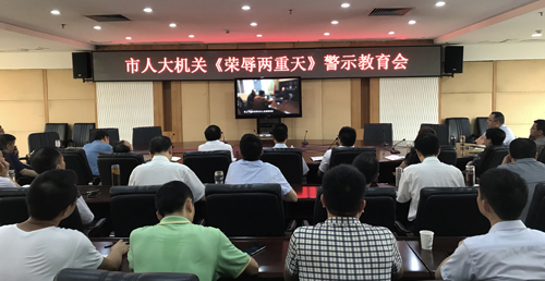 8月17日,市人大机关召开警示教育会,组织全体科级以上干部职工观看警示教育片《荣辱两重天》,该片讲述了内江市中级人民法院原院长熊晓平和内江市人民检察院原检察长钟长鸣,二人理想信念滑坡、道德丧失,从英雄沦为“阶下囚”的真实案例,告诫广大干部职工要时刻自警自省,警钟长鸣。