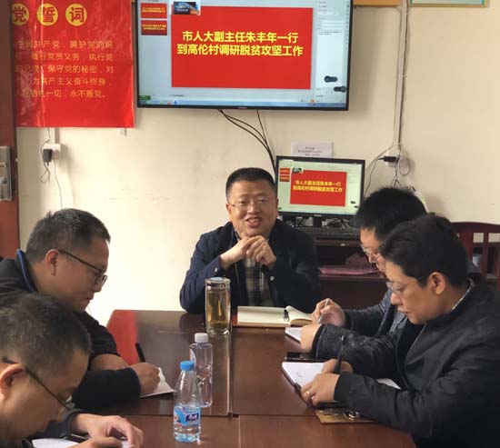 来到高伦村,朱丰年一行实地检查2018年脱贫攻坚工作落实情况,详细了解驻村工作组的工作和生活情况。在随后召开的座谈会上,高伦村村支两委就脱贫攻坚工作2018年完成情况及2019年工作计划进行汇报,各帮扶单位针对困难和问题提出建议意见10余条。朱丰年对高伦村以及帮扶单位的各项工作给与充分肯定。他强调,2019年是高伦村脱贫摘帽的关键之年,大家务必要针对脱贫验收标准,集中精力补齐硬件和软件上的短板。各帮扶单位要一起出资出力,共同完成村文化室、卫生室、会议室的维修改造工作。要高度重视软件资料建设,保质保量完成各项工作。要切实抓好宣传教育工作,引导贫困户进一步树立自力更生、主动发展的意识,拔除思想上的穷根。(文/谢书童 图/张健)
